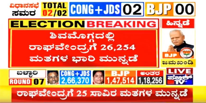 ಬೆಳಗ್ಗೆ: 9.55- ಶಿವಮೊಗ್ಗ ಬಿ.ಎಸ್.ಯಡಿಯೂರಪ್ಪ ಪುತ್ರ ಬಿ.ವೈ.ರಾಘವೇಂದ್ರ ಅವರಿಗೆ 18,808 ಮತಗಳ ಮುನ್ನಡೆ. ಇತ್ತ ಜಮಖಂಡಿಯಲ್ಲಿ ಕಾಂಗ್ರೆಸ್ ಗೆ ಮುನ್ನಡೆ