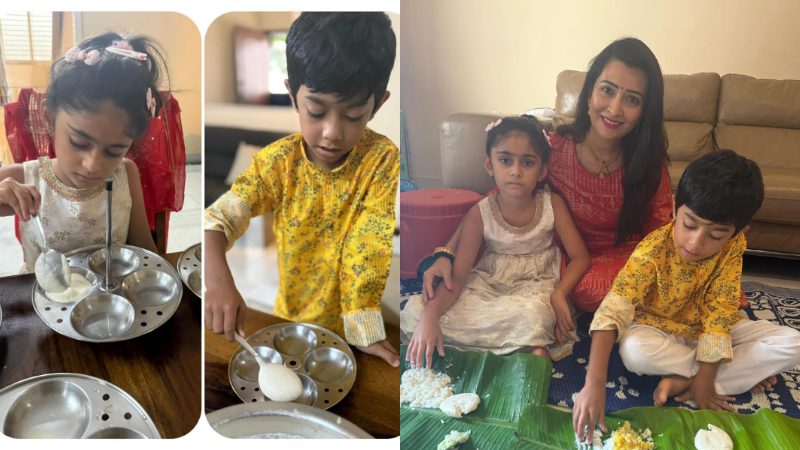 ‘ಈ ಬಾರಿ ಹಬ್ಬ ಅಮ್ಮನ ಮನೆಯಲ್ಲಿ’ ಎಂದು ಹಬ್ಬದ ತಯಾರಿಯ ಫೋಟೋಗಳನ್ನೂ ಪೋಸ್ಟ್ ಮಾಡಿದ್ದಾರೆ. ಪುಟ್ಟ ಮಕ್ಕಳು ಅಮ್ಮನಿಗೆ ಅಡುಗೆ ಮಾಡಲು ಸಹಾಯ ಮಾಡ್ತಿರುವ ಫೋಟೋ ಹಾಗೂ ಊಟ ಮಾಡುವ ಎಲೆಯಲ್ಲಿ ಇದ್ದ ಖಾದ್ಯಗಳನ್ನೂ ತೋರಿಸಿದ್ದಾರೆ. ಮಕ್ಕಳು ಗಣೇಶನಿಗೆ ಆರತಿ ಮಾಡಿ ಪೂಜೆ ಮಾಡಿದ್ದಾರೆ. ಕೊಂಕಣಿ ಸಂಪ್ರದಾಯದಲ್ಲಿ ಗೌರಿ-ಗಣೇಶ ಹಬ್ಬಕ್ಕೆ ವಿಶೇಷವಾಗಿ ಮಾಡಲಾಗುವ ವೈನಡೋರಿಯಿಂದ ಹಿಡಿದು, ಪಥೋಳಿ, ಮೋದಕ, ಚಕ್ಲಿ, ನೆವ್ರಿ, ಫೋಡಿ, ಅಂಬೊಡೆ, ಕಾರಟೆ ಘಸ್ಸಿ ಎಲ್ಲವೂ ತಮಗೆ ಸಿಕ್ಕಿತು ಎಂದು ಹೇಳಿ ಖುಷಿಪಟ್ಟಿದ್ದಾರೆ ರಾಧಿಕಾ. ಊಟ ಹಾಗೂ ಪೂಜೆಯ ತಯಾರಿಗಾಗಿ ಪುಟ್ಟ ಮಕ್ಕಳು ಮಾಡಿರುವ ಸಹಾಯ ಹೃದಯ ಹಾಗೂ ಹೊಟ್ಟೆಯನ್ನು ತುಂಬಿತು ಎಂದಿದ್ದಾರೆ ರಾಧಿಕಾ. ಇದನ್ನೂ ಓದಿ: ಪುಟ್ಟ ಗಣೇಶನ ಹಿಡಿದು ಸಿಹಿ ಸುದ್ದಿ ಹಂಚಿಕೊಂಡ ಐಶ್ವರ್ಯ-ವಿನಯ್ ದಂಪತಿ