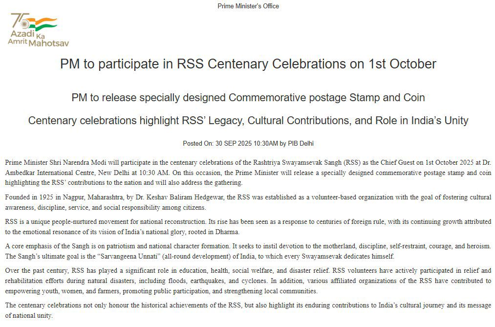 ರಾಷ್ಟ್ರೀಯ ಸ್ವಯಂಸೇವಕ ಸಂಘದ 100 ವರ್ಷಗಳ ಅದ್ಭುತ ಪಯಣವು ತ್ಯಾಗ, ನಿಸ್ವಾರ್ಥ ಸೇವೆ, ರಾಷ್ಟ್ರ ನಿರ್ಮಾಣ ಮತ್ತು ಶಿಸ್ತಿನ ಅಸಾಧಾರಣ ಉದಾಹರಣೆಯಾಗಿದೆ. ಆರ್ಎಸ್ಎಸ್ ಶತಮಾನೋತ್ಸವದ ಭಾಗವಾಗಲು ನನಗೆ ಅಪಾರ ಹೆಮ್ಮೆಯಾಗುತ್ತಿದೆ. ನಾಳೆ ವಿಜಯದಶಮಿ. ಇದು ಕೆಟ್ಟದ್ದರ ಮೇಲೆ ಒಳ್ಳೆಯದರ ವಿಜಯ, ಅನ್ಯಾಯದ ಮೇಲೆ ನ್ಯಾಯದ ವಿಜಯ, ಸುಳ್ಳಿನ ಮೇಲೆ ಸತ್ಯದ ವಿಜಯ ಮತ್ತು ಕತ್ತಲೆಯ ಮೇಲೆ ಬೆಳಕಿನ ವಿಜಯವನ್ನು ಸಂಕೇತಿಸುವ ಹಬ್ಬವಾಗಿದೆ. 100 ವರ್ಷಗಳ ಹಿಂದೆ ಈ ಮಹಾನ್ ದಿನದಂದು ಆರ್ಎಸ್ಎಸ್ ಅನ್ನು ಒಂದು ಸಂಘಟನೆಯಾಗಿ ಸ್ಥಾಪಿಸುವುದು ಕಾಕತಾಳೀಯವಲ್ಲ ಎಂದು ಬಣ್ಣಿಸಿದರು. ಇದನ್ನೂ ಓದಿ: ಬುರುಡೆ ಗ್ಯಾಂಗ್ನ ಅಸಲಿಯತ್ತು ಬಯಲು – ಚಿನ್ನಯ್ಯ ಕೋರ್ಟ್ಗೆ ತಂದಿದ್ದ ಬುರುಡೆ ಪುರುಷನದ್ದು!