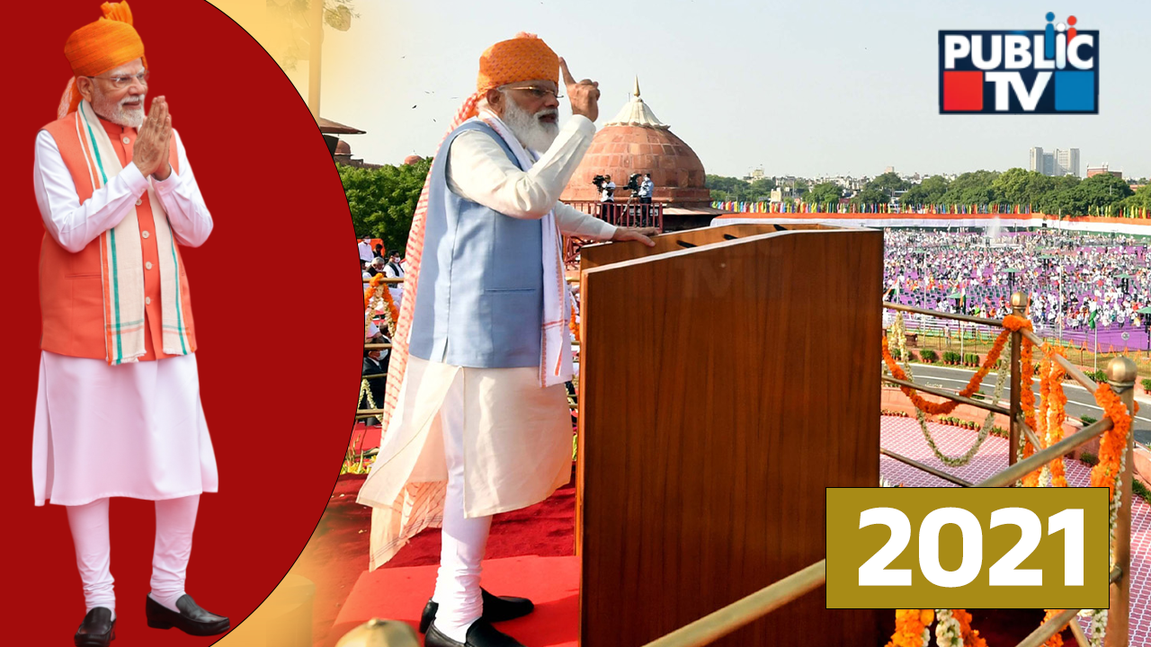 2021: 75ನೇ ಸ್ವಾತಂತ್ರ್ಯ ದಿನದಂದು ಪ್ರಧಾನಿ ಮೋದಿ ಸಾಂಪ್ರದಾಯಿಕ ಕುರ್ತಾ-ಚೂಡಿದಾರ್, ನೀಲಿ ಜಾಕೆಟ್ ಧರಿಸಿ ಕೇಸರಿ ಪೇಟದೊಂದಿಗೆ ಸ್ಟೋಲ್ ಧರಿಸಿ ಆಕರ್ಷಕ ಲುಕ್ನಲ್ಲಿ ಕಾಣಿಸಿಕೊಂಡಿದ್ದರು.