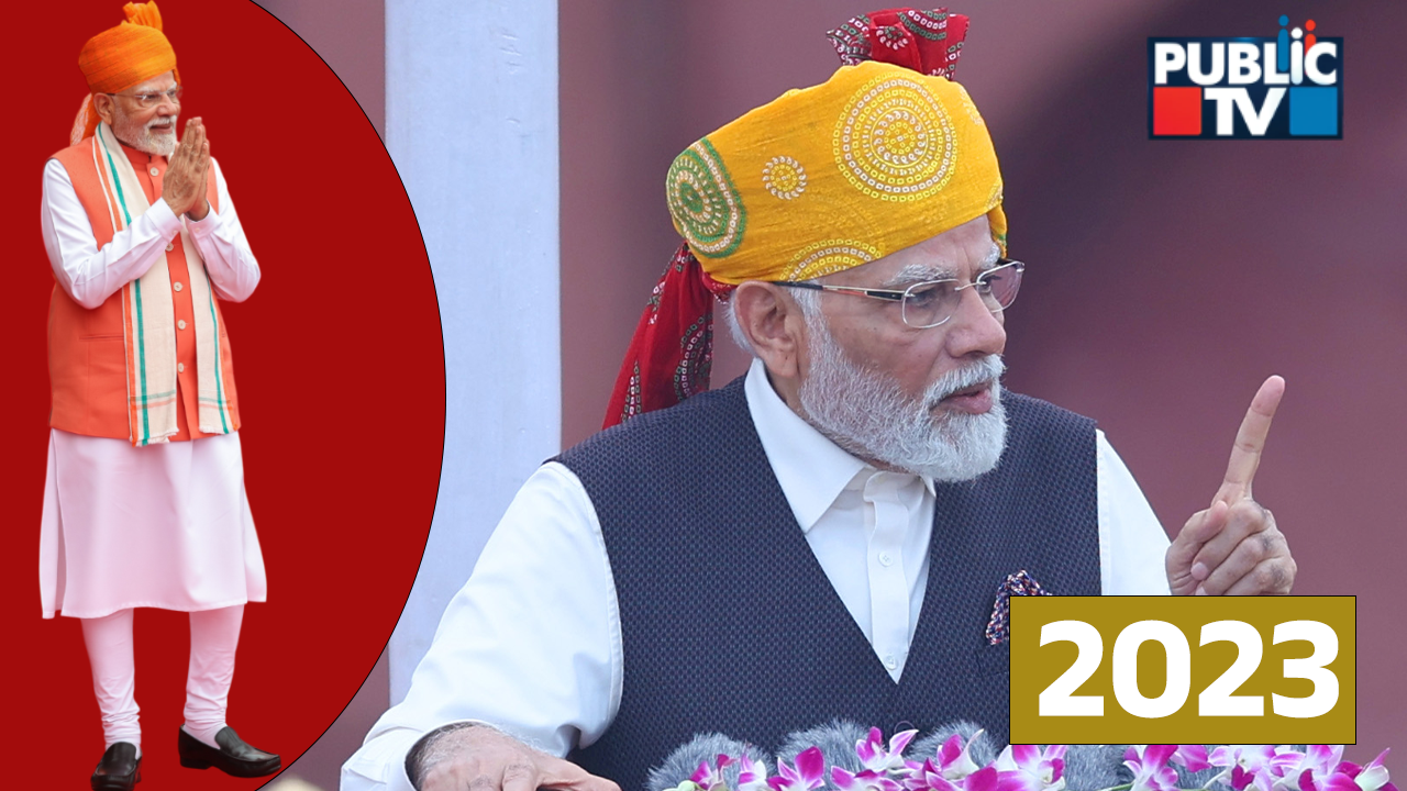 2023: ಹಳದಿ ಮತ್ತು ಕೆಂಪು ಬಣ್ಣದ ಸಫಾ ಧರಿಸಿದ್ದರು, ಅದರಲ್ಲಿ ಹಲವು ಬಣ್ಣಗಳ ಪಟ್ಟೆಗಳಿದ್ದವು. ಇದರ ಜೊತೆಗೆ ಮೋದಿ ಬಿಳಿ ಕುರ್ತಾ ಮತ್ತು ಕಪ್ಪು ಜಾಕೆಟ್ ಧರಿಸಿದ್ದರು.