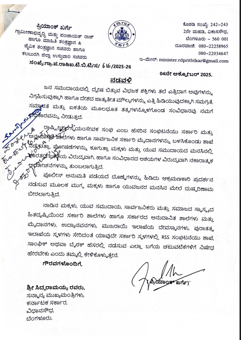 RSS ಬ್ಯಾನ್ಗೆ ಸಚಿವ ಪ್ರಿಯಾಂಕ್ ಖರ್ಗೆ ಸಿಎಂಗೆ ಪತ್ರ ಬರೆದ ವಿಚಾರಕ್ಕೆ ಪ್ರತಿಕ್ರಿಯೆ ನೀಡಿದ ಅವರು, ಪತ್ರ ಬರೆದಿರೋದು ಎಲ್ಲವೂ ನಿಮಗೆ ಗೊತ್ತಿದೆಯಲ್ಲ. ನೀವೇ ಹೇಳಿದಂತೆ ಅವರು ಪತ್ರ ಬರೆದಿದ್ದಾರೆ. ಶಾಲೆ, ಸರ್ಕಾರಿ ಜಾಗದಲ್ಲಿ ಬೇಡ ಅಂತ ಹೇಳಿದ್ದಾರೆ ಅದರ ಬಗ್ಗೆ ನನಗೆ ಗೊತ್ತಿಲ್ಲ. ಸಿಎಂ ಅವರು ಅದರ ಬಗ್ಗೆ ಚರ್ಚೆ ಮಾಡ್ತಾರೇನೋ, ಸಿಎಸ್ ಅವರು ನಿರ್ಧಾರ ತೆಗೆದುಕೊಳ್ತಾರೆ ಅಂತ ಹೇಳಿದರು.