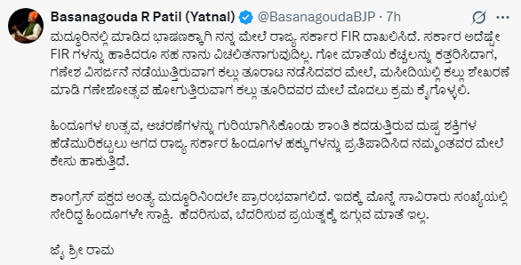 ತಮ್ಮ ವಿರುದ್ಧ ಮದ್ದೂರಿನಲ್ಲಿ ದಾಖಲಾಗಿರುವ ಎಫ್ಐಆರ್ (FIR) ವಿಚಾರವಾಗಿ ಎಕ್ಸ್ ಖಾತೆಯಲ್ಲಿ ಪೋಸ್ಟ್ ಹಂಚಿಕೊಂಡಿದ್ದಾರೆ. ಸರ್ಕಾರ ಅದೆಷ್ಟೇ ಎಫ್ಐಆರ್ ದಾಖಲಿಸಿದರೂ ಕೂಡ ನಾನು ವಿಚಲಿತನಾಗುವುದಿಲ್ಲ. ಹಿಂದೂಗಳ ಉತ್ಸವ, ಆಚರಣೆಗಳನ್ನು ಗುರಿಯಾಗಿಸಿಕೊಂಡು ಶಾಂತಿ ಕದಡುತ್ತಿರುವ ದುಷ್ಟ ಶಕ್ತಿಗಳ ಹೆಡೆಮುರಿಕಟ್ಟಲು ರಾಜ್ಯ ಸರ್ಕಾರಕ್ಕೆ ಆಗುತ್ತಿಲ್ಲ. ಹೀಗಾಗಿ ಹಿಂದೂಗಳ ಹಕ್ಕುಗಳನ್ನು ಪ್ರತಿಪಾದಿಸಿದ ನಮ್ಮಂತವರ ಮೇಲೆ ಕೇಸು ಹಾಕುತ್ತಿದೆ. ಹೆದರಿಸುವ, ಬೆದರಿಸುವ ಪ್ರಯತ್ನಕ್ಕೆ ಜಗ್ಗುವ ಮಾತೆ ಇಲ್ಲ ಎಂದು ಆಕ್ರೋಶ ಹೊರಹಾಕಿದ್ದಾರೆ.ಇದನ್ನೂ ಓದಿ:ಮದ್ದೂರಲ್ಲಿ ಪ್ರಚೋದನಕಾರಿ ಭಾಷಣ – ಬಿಜೆಪಿ ಶಾಸಕ ಯತ್ನಾಳ್ ವಿರುದ್ಧ ಎಫ್ಐಆರ್
