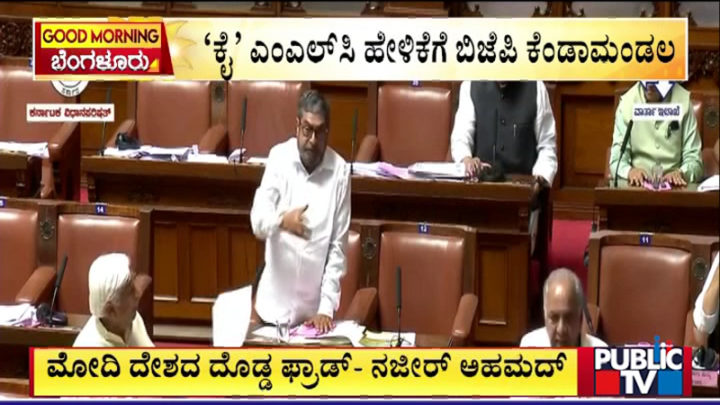 ಬೆಂಗಳೂರು: ಪ್ರಧಾನಿ ನರೇಂದ್ರ ಮೋದಿ (Narendra Modi) ಈ ದೇಶದ ದೊಡ್ಡ ಫ್ರಾಡ್ ಎನ್ನುವ ಕಾಂಗ್ರೆಸ್ನ ವಿಧಾನಪರಿಷತ್ ಸದಸ್ಯ ನಜೀರ್ ಅಹ್ಮದ್ (Naseer Ahmed) ಹೇಳಿಕೆ ಸದನದಲ್ಲಿ ಭಾರೀ ಕೋಲಾಹಲ ಎಬ್ಬಿಸಿತು. ಬಿಜೆಪಿ, ಕಾಂಗ್ರೆಸ್ ಸದಸ್ಯರ ನಡುವೆ ಭಾರೀ ವಾಗ್ವಾದ ನಡೆಯಿತಲ್ಲದೇ ತಡರಾತ್ರಿ ವರೆಗೂ ಬಿಜೆಪಿ ಸದಸ್ಯರಿಂದ ಪ್ರತಿಭಟನೆ (BJP Protest) ನಡೆಯಿತು. ಕೊನೆಗೆ ಸಭಾಪತಿ ಎಚ್ಚರಿಕೆ ಬಳಿಕ ನಜೀರ್ ಅಹ್ಮದ್ ಸದನಕ್ಕೆ ಕ್ಷಮೆಯಾಚಿಸಿದ್ರು.