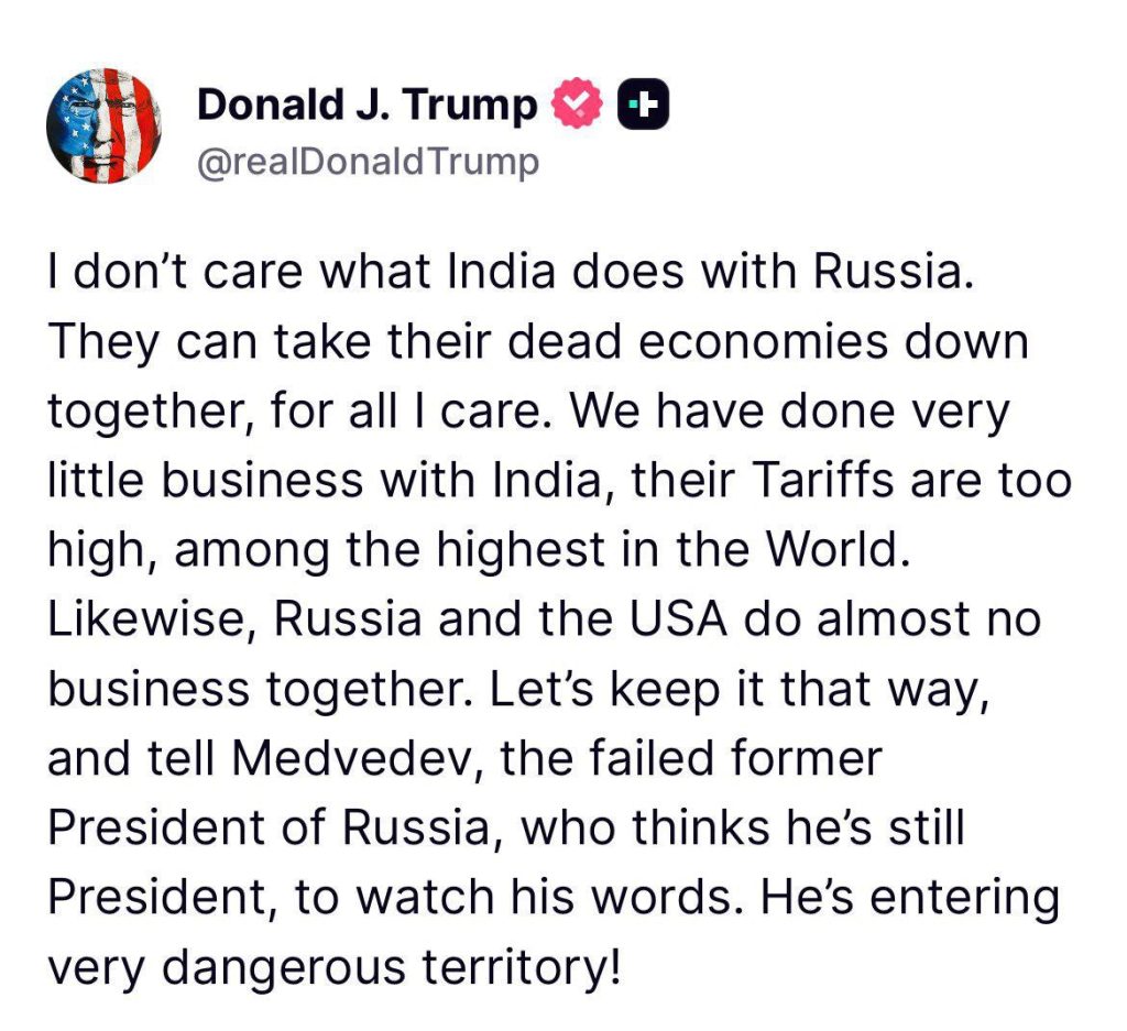 ಈಗ ಏನೋ ಟ್ರಂಪ್ ಮೋದಿ ನನ್ನ ಮಿತ್ರ ಎಂದು ಹೇಳುತ್ತಿದ್ದರೂ ಶ್ವೇತ ಭವನದ ಅಧಿಕಾರಿಗಳು ಭಾರತವನ್ನು ಗುರಿಯಾಗಿಸಿ ಹೇಳಿಕೆ ನೀಡುತ್ತಿದ್ದಾರೆ. ಇನ್ನೊಂದು ಕಡೆ ಟ್ರಂಪ್ ಯುರೋಪ್ ದೇಶಗಳಿಗೆ ಭಾರತದಿಂದ ಆಮದಾಗುವ ವಸ್ತುಗಳಿಗೆ 100% ತೆರಿಗೆ ವಿಧಿಸುವಂತೆ ಹೇಳಿರುವುದಾಗಿ ವರದಿಯಾಗಿದೆ.